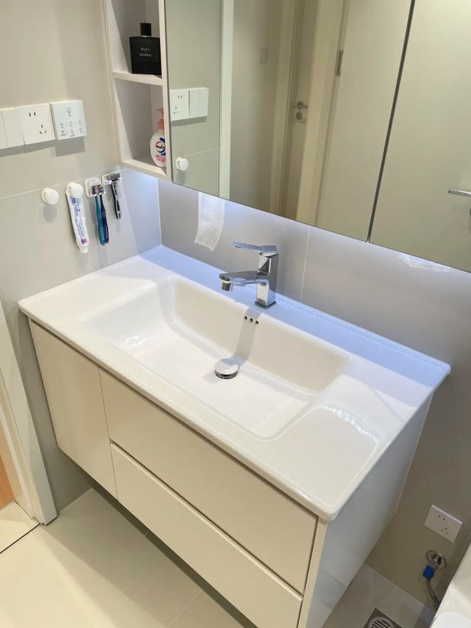 所以,我更倾向给浴室柜做“一体盆设计”,美观、大气,真正可以做到卫生无死角,日常维护特别轻松。