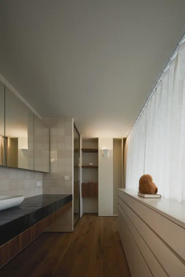 天花顶部则利用换气扇所需深度,设计成弧形反灯槽天花。洗漱台采用现场砌台并贴手工砖,让物件与空间在此刻产生共鸣。