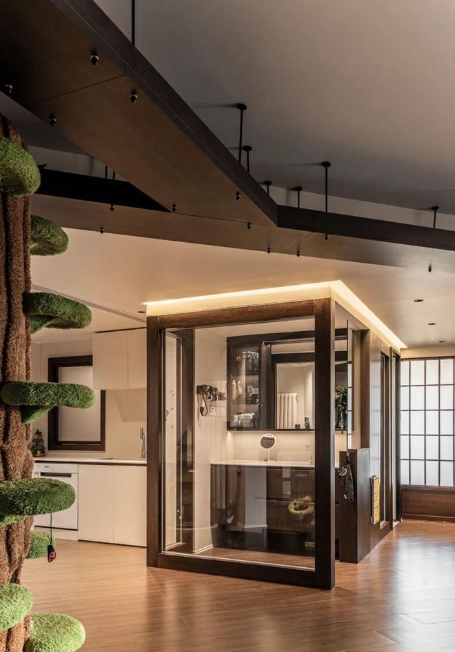 原户型是异形房,私密性不够存在一些空间浪费,经过设计师调整后,拆除掉部分墙面对户型空间进行了优化,同时还增加了猫咪洄游动线,实现空间灵活切换,整体更通透实用。