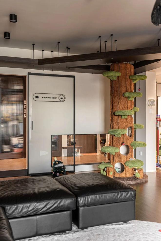 玄关处增设隔断划分区域,让空间层次感瞬间拉满。同时嵌入定制猫爬架,闲置角落变身猫咪乐园,空间利用率直接拉满~