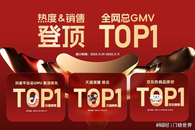 本次双十一期间,Kaadas凯迪仕智能锁全网总GMV强势登顶榜首,实现热度与销量的双重突破。在多个核心电商平台均表现优异:抖音平台总GMV断层领先拿下 TOP1;天猫官旗排名稳居TOP1;京东热销品牌榜同样斩获首位。
