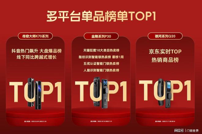 各产品系列也表现突出:传奇大师K70系列位列抖音热门飙升大盘爆品榜第一,并实现线下同比跨越式增长。金刚系列P30在天猫平台跻身十大类目热卖榜,同时持续霸榜指纹识别、五优认证及人脸识别智能门锁等多个细分热卖榜单。银河系列Q20也登上京东实时热销商品榜榜首。