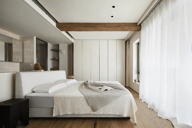 二楼主卧是屋主的专属身心栖息之所,延续了一楼公区的克制与温润风格。整体以清透的白色为基调,搭配脚感温润的实木地板,顶部用老榆木包裹原有梁位,营造出永不过时的优雅质感。