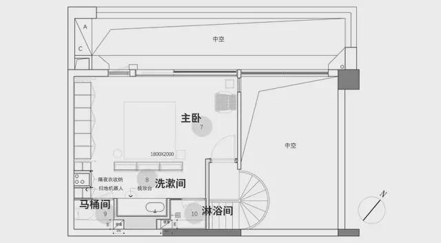 设计师将原有直梯改为旋转楼梯,是本次改造的关键决策之一。旋转的弧形造型为空间注入艺术韵律,也节省了占地空间。改变上楼方向后,动线更便捷,也强化了从公共区域进入私密区域的仪式感。