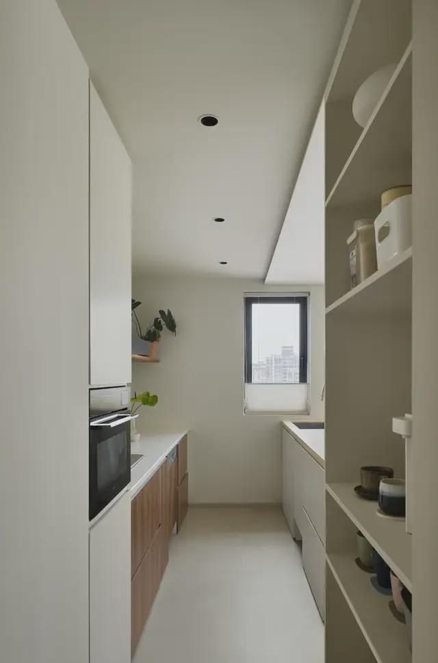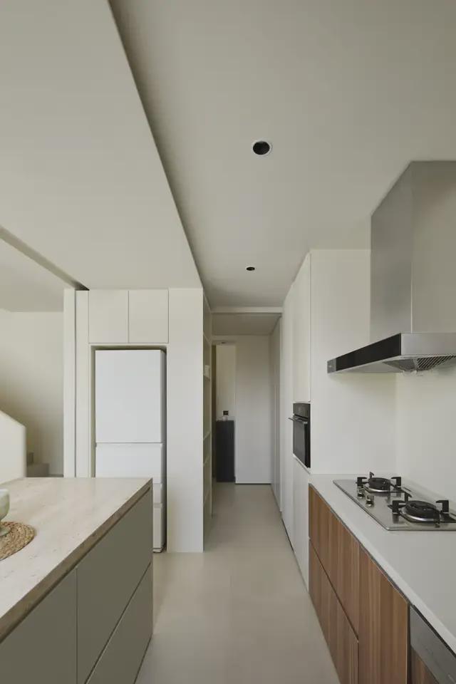 厨房流畅的动线是美味诞生的秘钥,通过裁切门洞与玄关形成洄游动线,增强两个区域之间的连贯与互动。共墙一侧安排了开放式收纳与冰箱柜,提升实用性能。