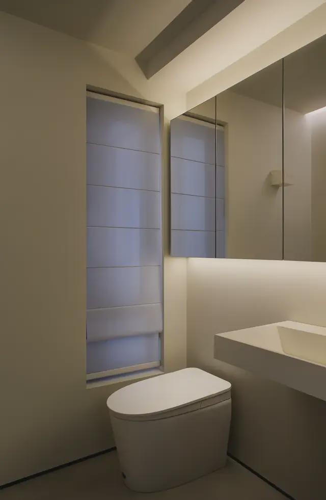 一楼卫生间巧妙利用整面镜柜的反射效果,瞬间扩大卫生间的视觉空间,让狭小的浴室看起来更加宽敞明亮。公卫的每一个角落都井然有序,舒适宜人。