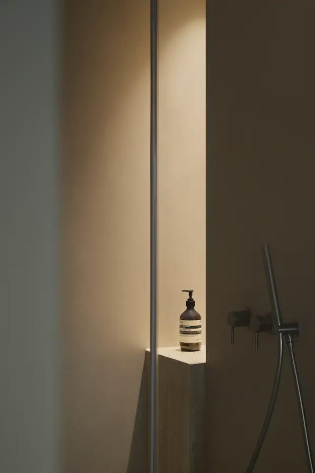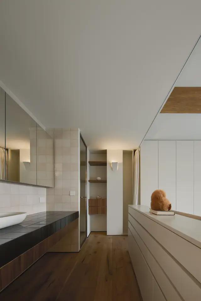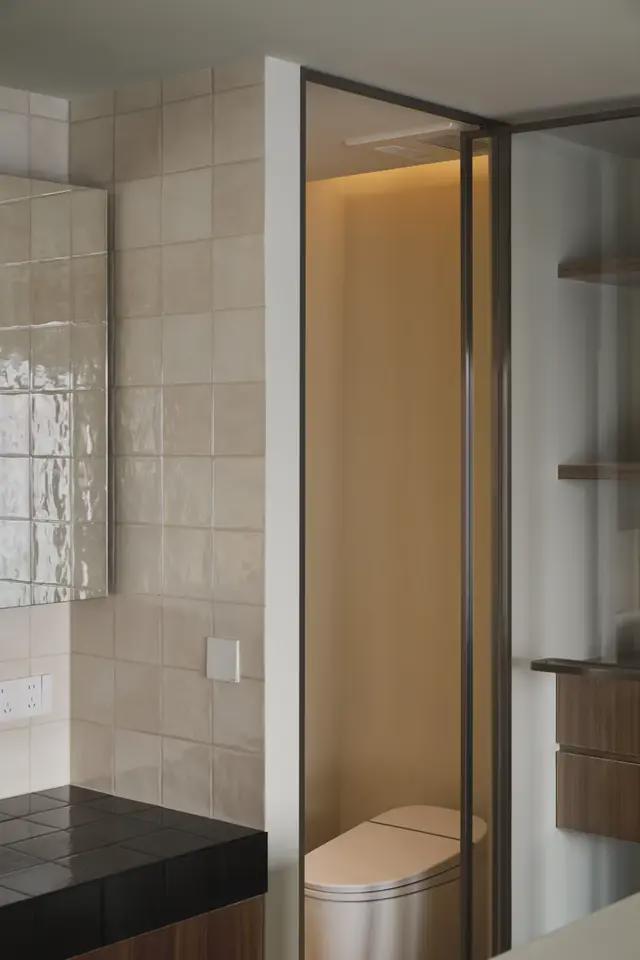 天花顶部则利用换气扇所需深度,设计成弧形反灯槽天花。洗漱台采用现场砌台并贴手工砖,让物件与空间在此刻产生共鸣。