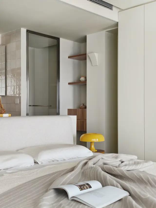 主卧与卫生间之间,摒弃了常规的砌墙或推拉门,采用帘子作为软隔断,巧妙地融合了空间感与自由感,让采光能够洒满卧室的每一寸角落,带来自在与安心的体验。