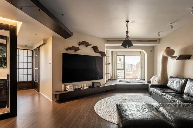 客厅这一块,未改造之前有一些采光问题,就把客厅和阳台打通了,同时在墙上顶上都装了猫咪通道,这样毛孩子们可以尽可能的释放天性。