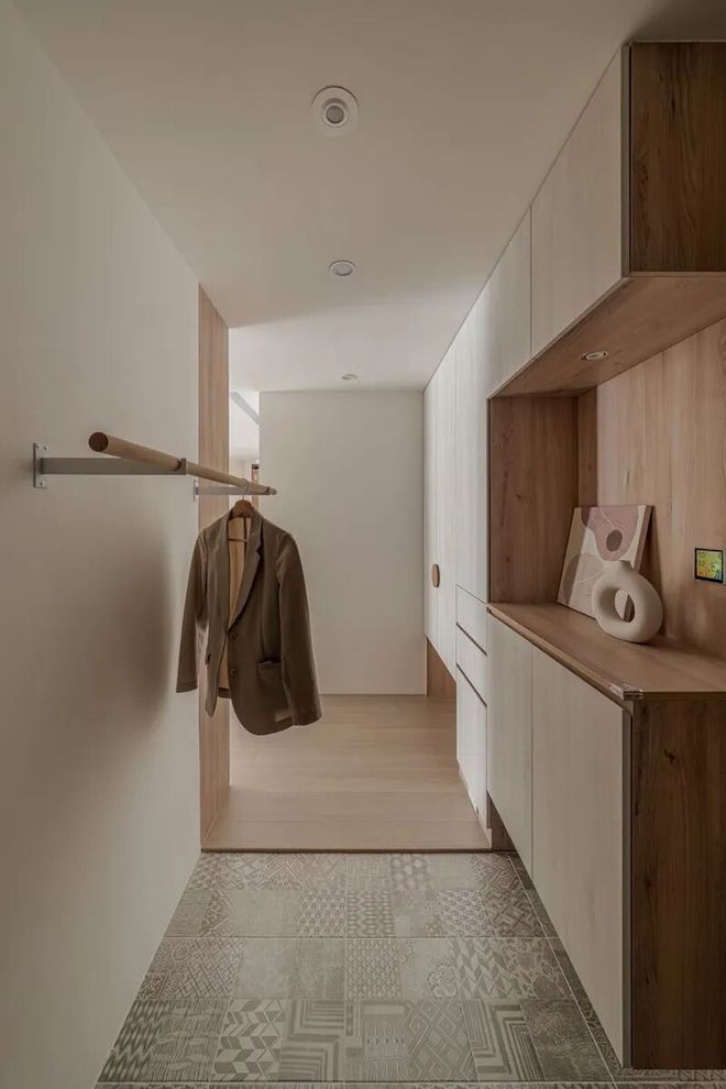 仅在右侧,砌造一座浅白交织原木色蕴的玄关柜