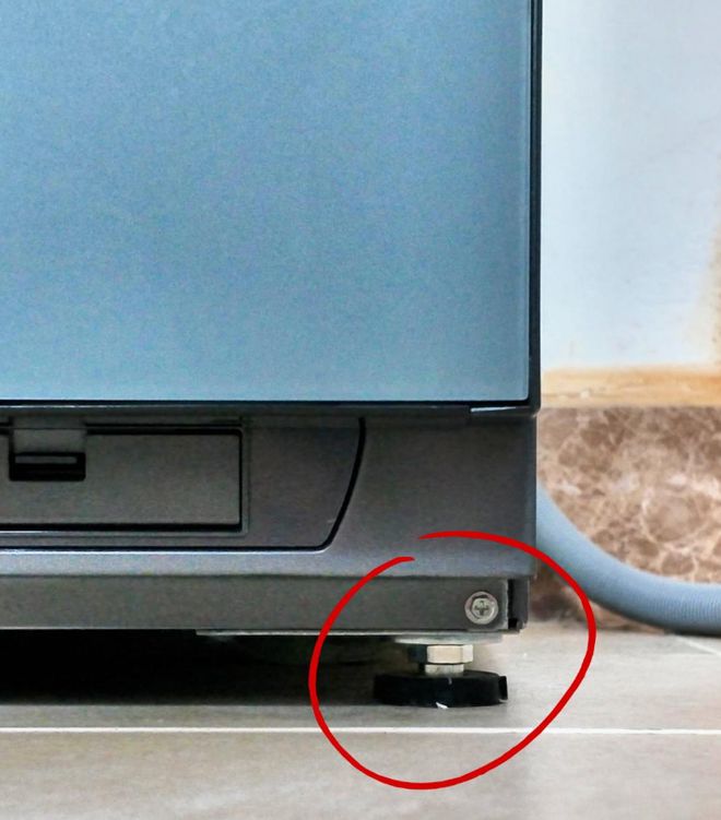 洗衣机并不是整个放在地上的,而是像桌子一样有四个“腿”,也就是它的支脚了。洗衣机的前面两个支脚是活动的,可以通过旋转来调整高低,使用前要调整好。