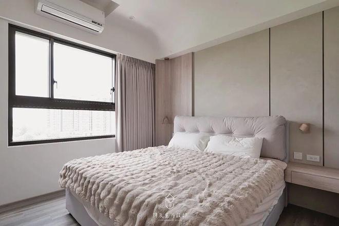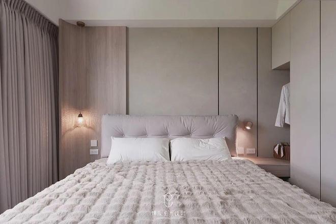 主卧灯饰选择富含巧思,右侧选用木质灯饰