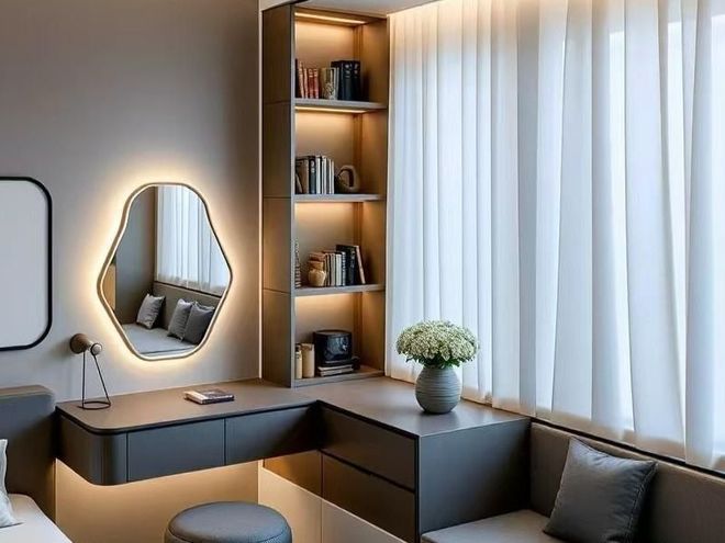 做法建议:飘窗改功能区之前,要确认飘窗的结构是否能拆改。而桌面或书架与飘窗的连接处,要处理精细,不能留尖锐直角。同时,要配备遮光窗帘,以防阳光的暴晒。