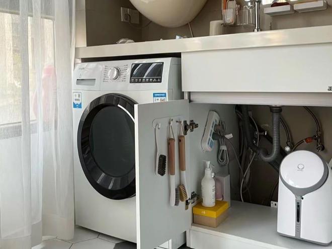 旁边的柜体空间,可以用来收纳洗衣液,柔顺剂,衣架,熨斗等所有的清洁物品,上面的抽拉衣架可以用来挂洗完的衣服。