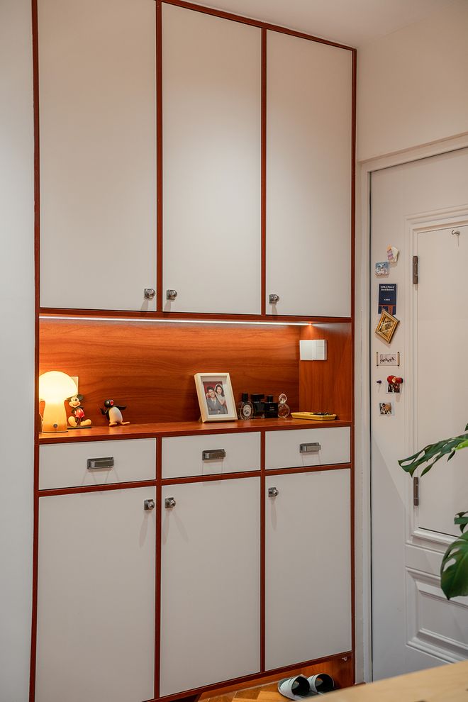 顶天立地的玄关鞋柜这么多年,依然是大家鞋柜选择最多的,分上中下三部分超能装。上层放出门要带的帽子、包包,拿取方便;中间留空,钥匙、耳机、香水这些小物件随手放;下层有抽屉+鞋柜,抽屉收小杂物超实用,底部还留了空位,不用弯腰就能放常穿的鞋,整洁又省心。