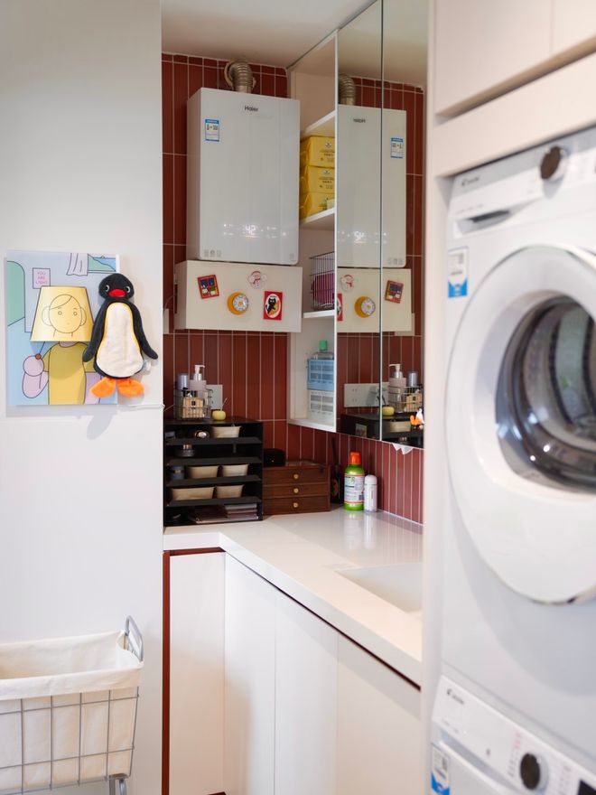 在最初连接阳台的地方有一根大的承重柱,经过一些设计小巧思,把它和岛台连在一起,刷成渐变红当小背景,直接一个变废为宝,使家里的空间层次变得更加的丰富。做饭时聊趣事、吃饭时扯家常,这种自然紧密的互动让情感传递得毫无阻隔。