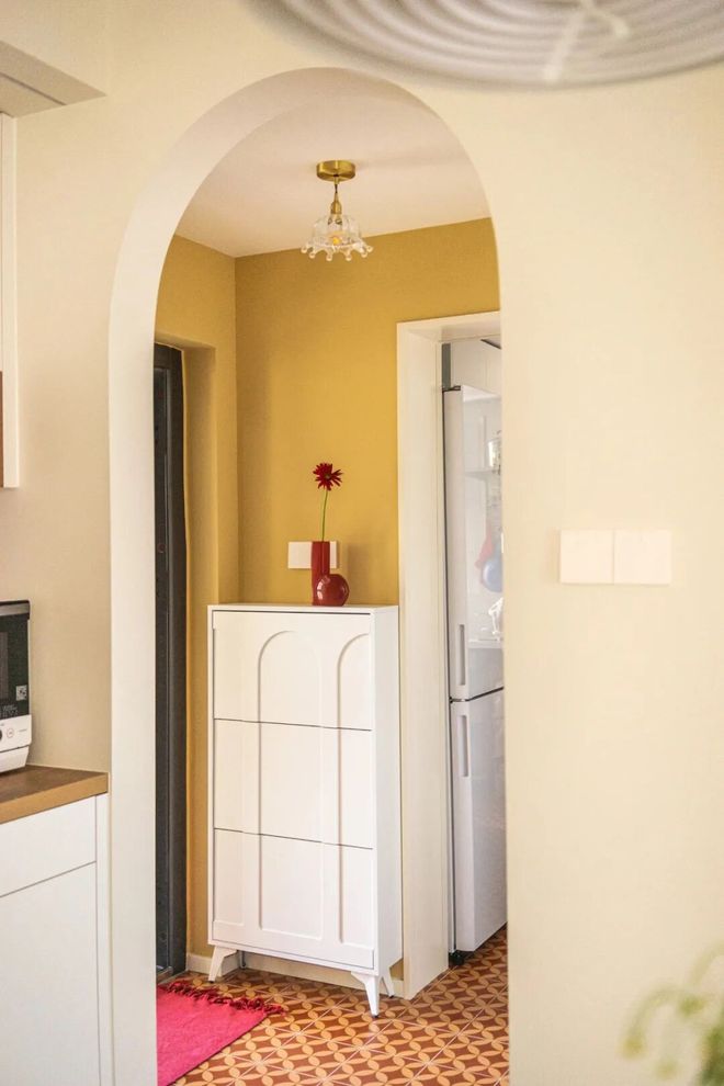 拆除门厅与干区的隔墙,巧妙借用卫生间面积,嵌入一个顶天立地的鞋柜,终于解决了无玄关收纳的尴尬。