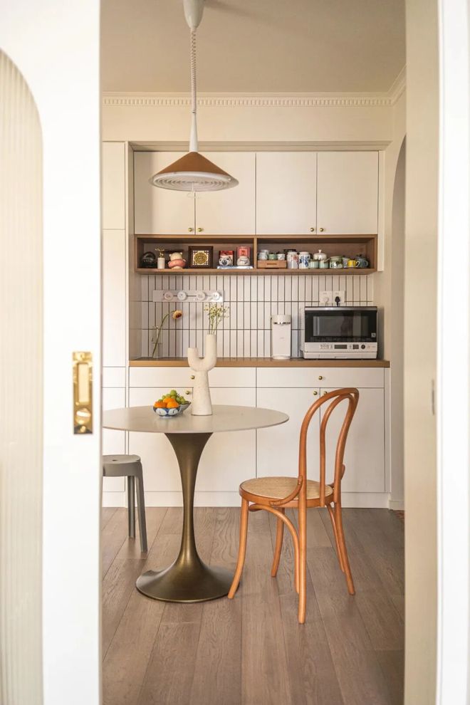 厨房收纳不足,便让餐厅来凑。在餐厅区域增设备餐柜,有效分担了厨房的储物压力,形成流畅的功能互补。