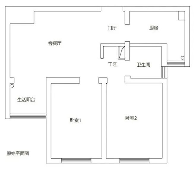 这是一套面积仅50平米的迷你两居。户型虽功能齐全,但每个空间都略显紧凑:门厅放不下鞋柜,厨房转身都困难,唯有干湿分离的卫生间和独立生活阳台算是亮点。