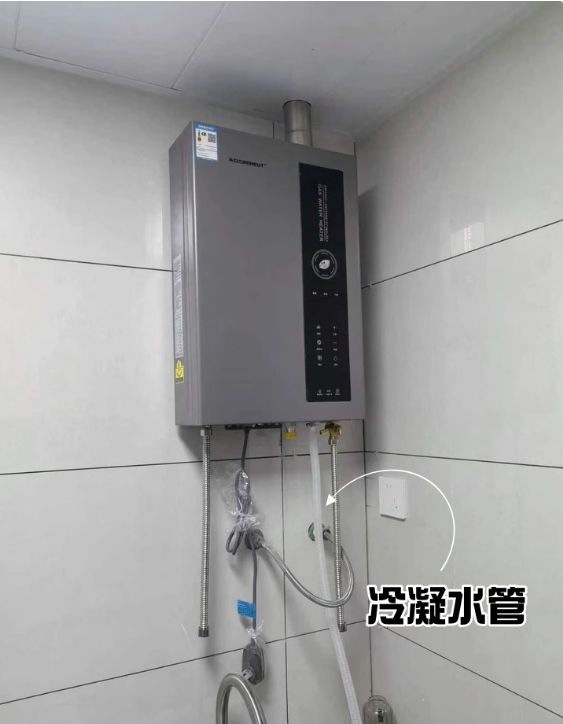 所以所有一级能效的燃气热水器,下面(角阀附近)都会有一根长长的冷凝水管。你不光要保护这根水管,还得给它找一个排水口——多数人没有在热水器下方预留排水管,就只能把它放在水槽里,丑爆了。