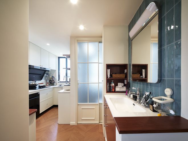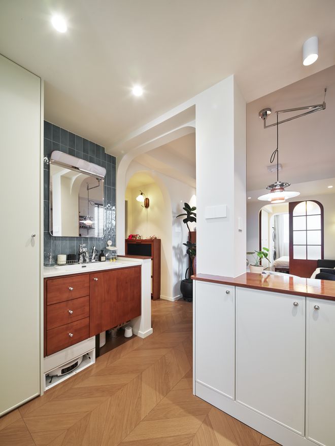 在此基础上,洗手台与卫生间入口之间,巧妙嵌入一组“一门到顶”的窄边柜。这一设计不仅完美利用了原本会被浪费的过渡区域,提供了便捷的收纳空间,更在视觉上构成了自然的功能区分隔。