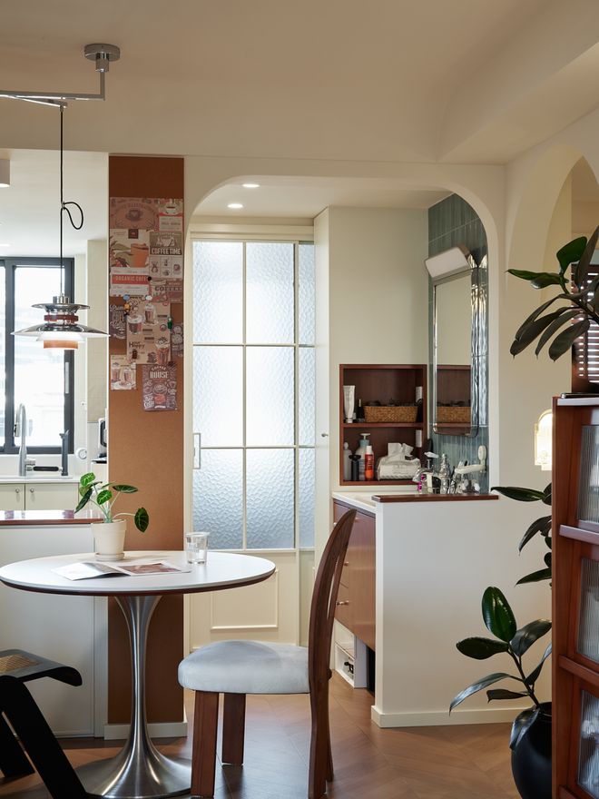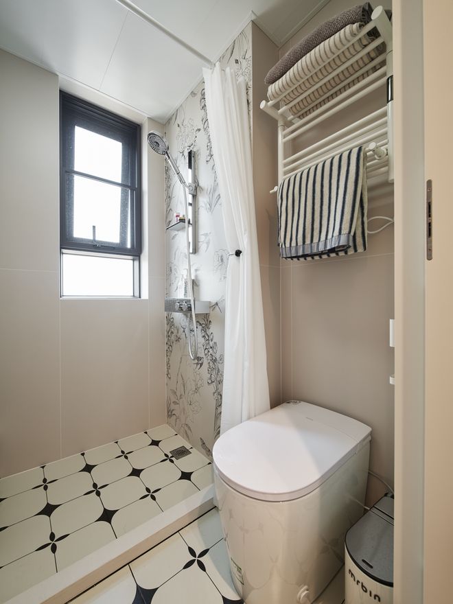 内部则紧凑布局马桶与淋浴区,最终在极小的面积内,成功打造出一个功能完备、彼此独立、且收纳能力超乎想象的干湿分离卫生间。