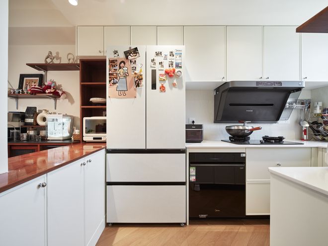 未改造前,餐厅区域被一面定制墙体所占据,导致空间闭塞且功能单一。设计中将此墙体完全拆除,使餐厅与厨房整合为一个开放的联动整体。