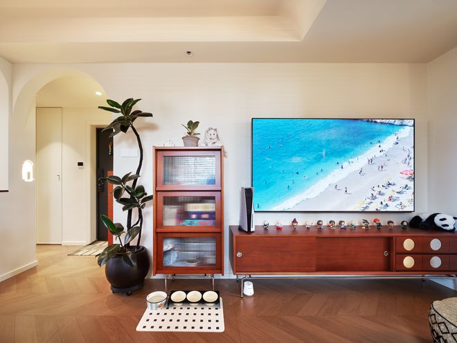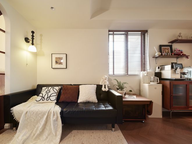 造前,原客厅空间局促,无法满足电视机的常规摆放需求。为彻底解决问题,就将将卧室与客厅之间的隔墙拆除,并整体向内推移70公分重建,调整过后,不仅重塑了公共区域的整体格局,还提升了客厅整体的开阔感。