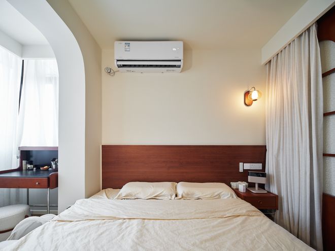 在功能布局上,床尾定制2.5米通顶大衣柜,收纳容量巨大,能轻松收纳所有换季衣物与被褥。床头以简约护墙板结合上方暗藏灯带,取代传统床靠,节省空间的同时,营造出柔和高级的睡眠氛围。