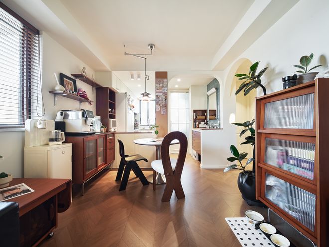 在地面材质的选择上,采用木纹砖通铺,既具备出色的耐用性与易打理特性,其温润的木质纹理亦为空间注入了一抹复古韵味,视觉上更显连贯与流畅。