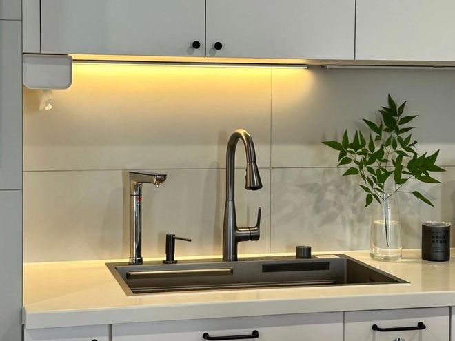 柜下感应灯,可以让厨房切菜备菜时,身体不会遮挡光源,操作台面一览无余,安全又舒适。
