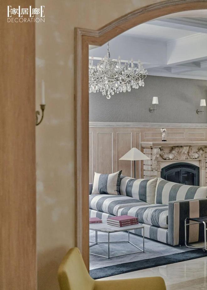 主客厅中,Armani/Casa的落地灯和经典条纹沙发被保留了下来。