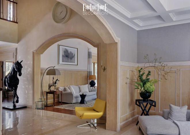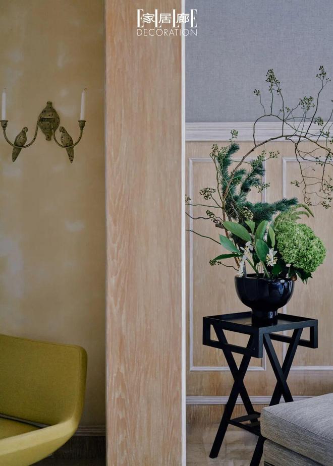 当下的生活与审美,不再强调面面俱到的精致或者过于惹眼的装饰,反而回归一种松弛自然的优雅。比如,在房子设计之初,袁宗磊发现了一款在市场上尚未被使用的艺术漆,可以呈现如欧洲历史建筑般斑驳沉淀的墙体肌理,为此,他邀请了艺术院校的学生以手绘的形式打造出独特的挑高的墙面。