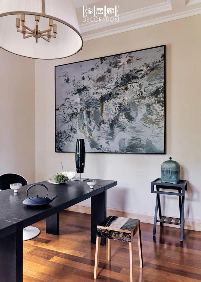 进入一层,欧式坡屋顶的天花板高低起伏,营造出生动的层次感。从主客厅到第二客厅,再到厨房与餐厅,整个空间开敞而流动,如同舒适的法式沙龙,朋友们可以随意聚集,三五成群地谈笑。只有茶室单独隔出来,被安排在入口处。这一细节既承载了中国文化的礼序,也为日常生活保留了一处安静角落。袁宗磊说,中国人需要茶室,西方人习惯客厅,而真正的当代生活应该能同时容纳两者。茶室里,中国艺术家黄渊青以书法为灵感的抽象画,与来自意大利的茶桌相得益彰。