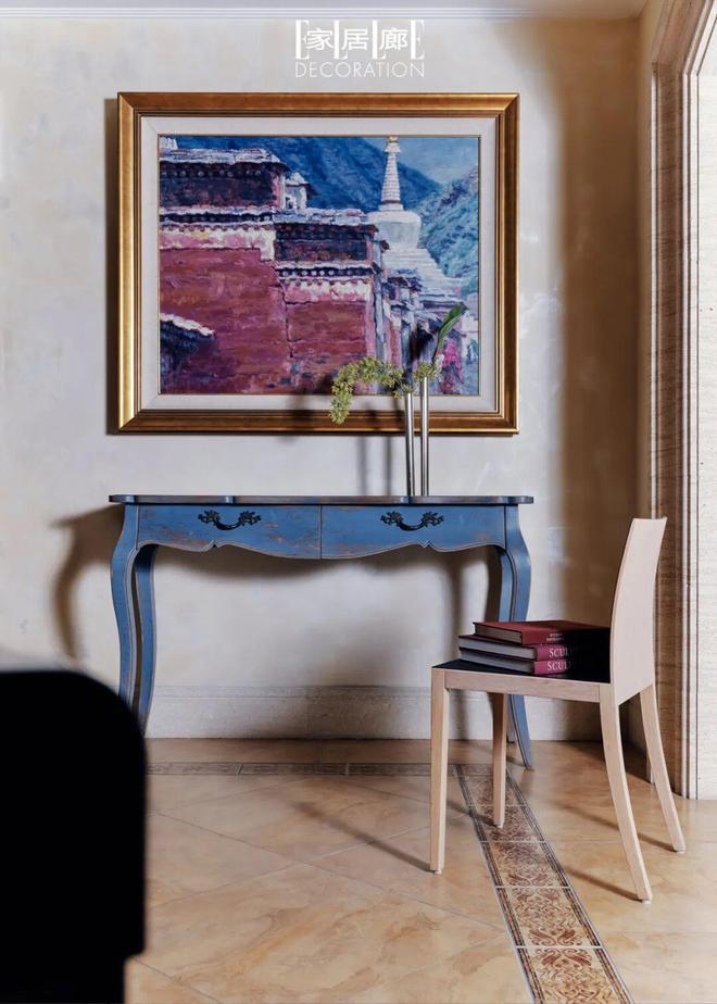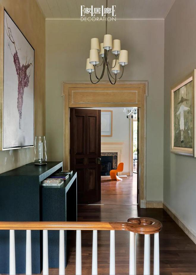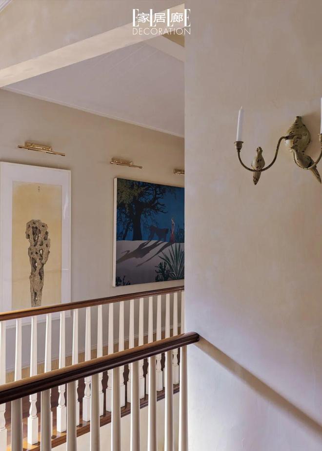 楼梯间镜头的一角,也被艺术品与家具温柔地装饰起来。