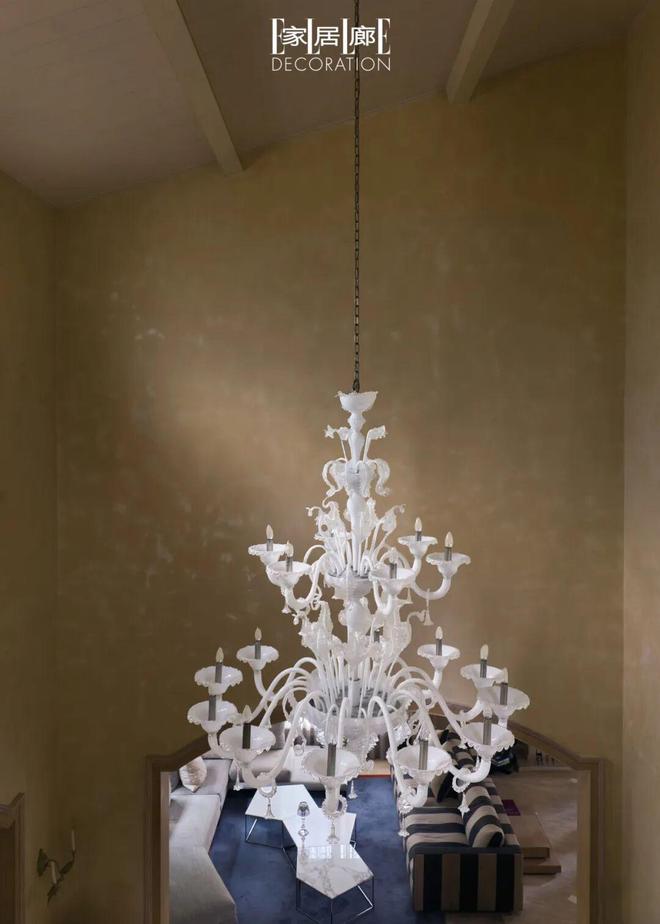 步入大门,第一件映入眼帘的作品,是法国艺术家Arnaud Kasper的“半马”青铜雕塑,立在玄关处,瞬间营造出充满想象力的氛围。楼梯旁的挑高空间达七米多,一盏意大利手工吹制的吊灯自顶垂下,在斑驳的艺术漆墙面上投下光影,恢弘而静谧。