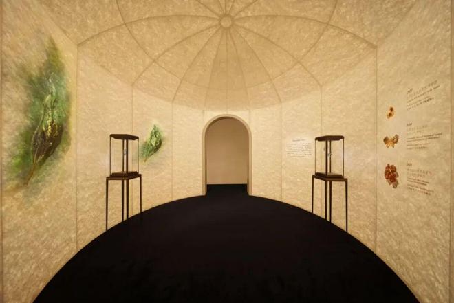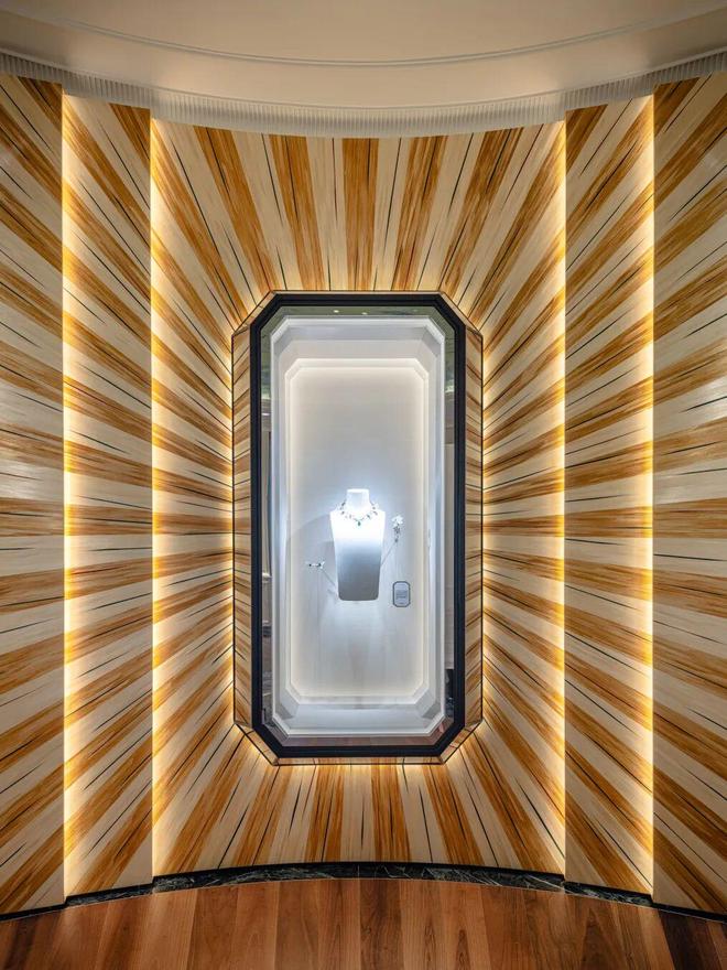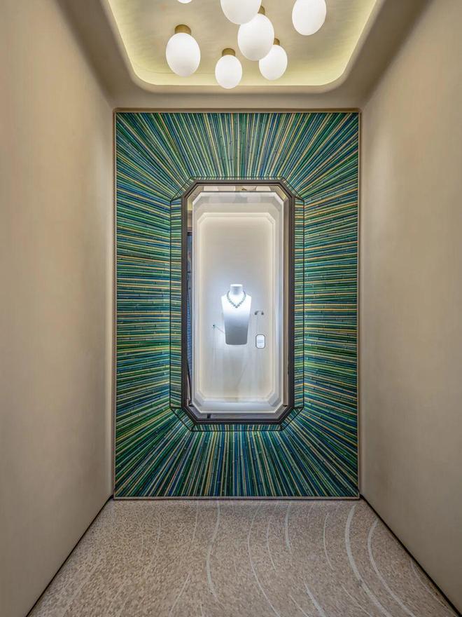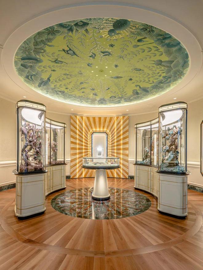 以“冬景花园”为灵感,入口的亭阁不仅是醒目的视觉亮点,也是可供驻足的空间。旗舰店的第二个入口同样呼应自然主题,向中国古典园林的诗意之美致敬。穿过户外,宾客可进入旗舰店内部。第一个空间的设计遵循风水理念,旨在营造能量和谐流动的意境。室内空间亦不乏自然元素,来自艺术家纺织艺术家Huihui的两件织物作品、艺术家Claire Nicolet绘制的穹顶画作、艺术家Olga Thune-Larsen参与创作的秸秆镶嵌工艺中央展柜等作品与宝诗龙标志性的珠宝作品相得益彰。