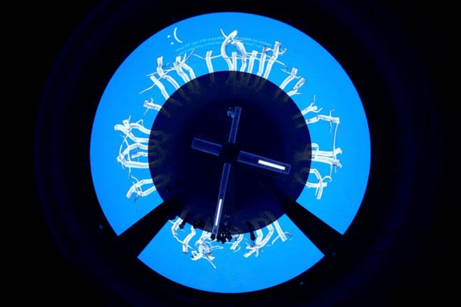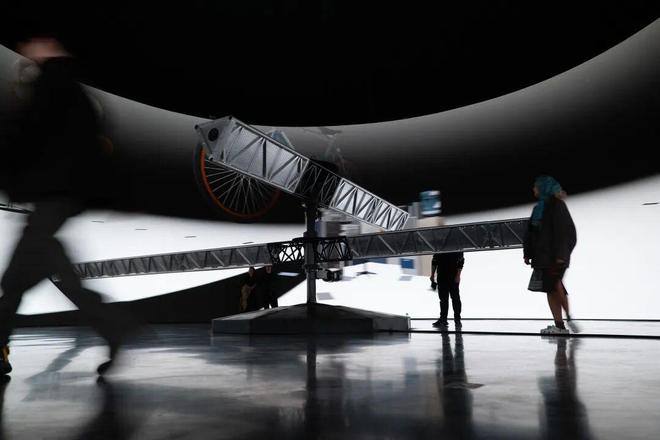 罐体侧壁的影像与指针同频,不断变换时空的形态,空间的意义也随之转变。在这个封闭而连续的空间装置中,现实与虚拟相互渗透、机械与光影同时成为压迫与引导身体行动的力量。时间牧场中转动的指针,不断驱使和改变着场中人群的形态和行为,也引发思考,当人被时间支配,命运被时间塑形,面对这恒久永动的力量,人们该如何选择面对它的姿势。