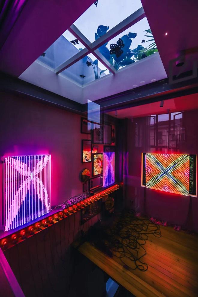 拾光而上,艺术家王一收藏的古早镜子,分布在亭子间两侧,与霓虹灯光相互呼应,构建出一种微妙的光影关系。在这里,发光体与反射体共同编织了一个关于感知的空间,观众的身影也成为作品的一部分,在虚实之间游走。展览激活了亭半空间的通透性与可能性,使艺术成为空间叙事的自然延伸。