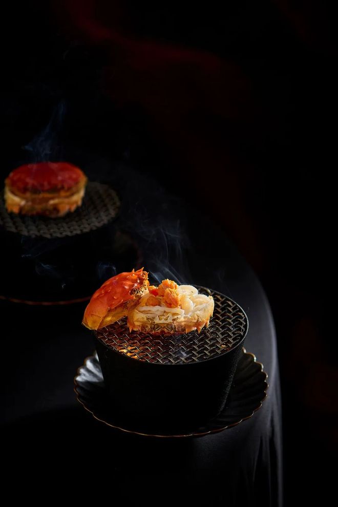 本场玄宴由“食庐”与THE TABLE Studio联合呈现,将霍克尼“分解与重构”的艺术理念转译于餐桌。每道菜品皆是对其作品的味觉回应——将熟悉风味拆解重组,在器物与火候中重新合拢。灯光、投影与美食交织,共塑“可被阅读的菜”。菜单对应展览叙事,既是对传统蟹宴的现代演绎,亦是艺术理念的味觉隐喻。蟹麒鳞将整蟹拆解,与鸭肝、菌菇等重组后还原蟹形;“鱼蟹盏”以石斑鱼面条重构“蟹黄面”,让每道菜成为视觉与味觉的对话。