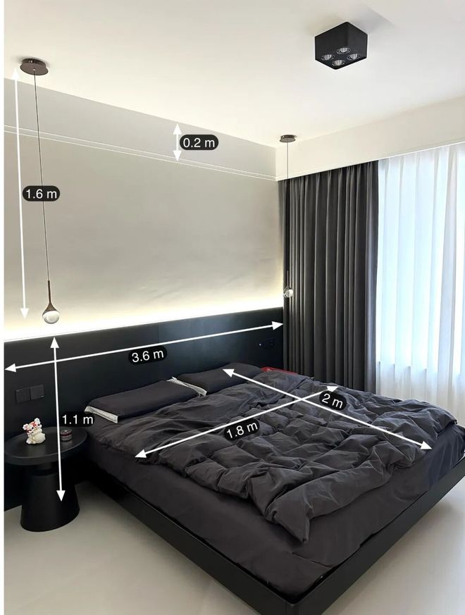 2)3m开间的卧室,做好床尾柜后,差不多能剩下43cm的空间,虽然略显局促,但好在日常通行频率并不高。(记得搭配无靠背床)