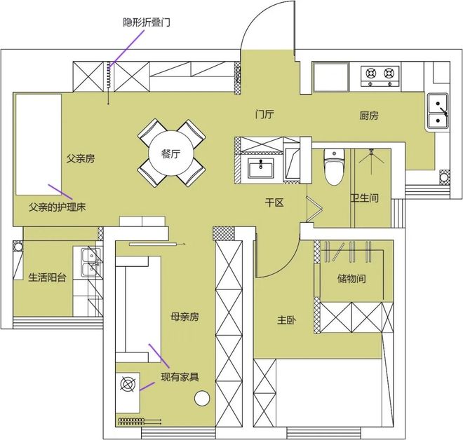 【灵活的隐私边界】:父亲区域与餐厅之间采用隐形折叠门,闭合时保障父亲休息的私密与宁静,开启时则让空间完全融会贯通。
