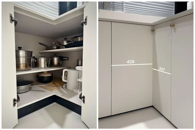 不少人都知道橱柜转角是一块强大的收纳空间,但由于拿取不便,往往只能放一些杂物。