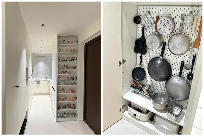相较于吊柜,高柜无疑有着更强大的收纳力,并且收纳上更加灵活。比如给柜子内部安装上洞洞板,就解决了各种锅具的收纳需求。