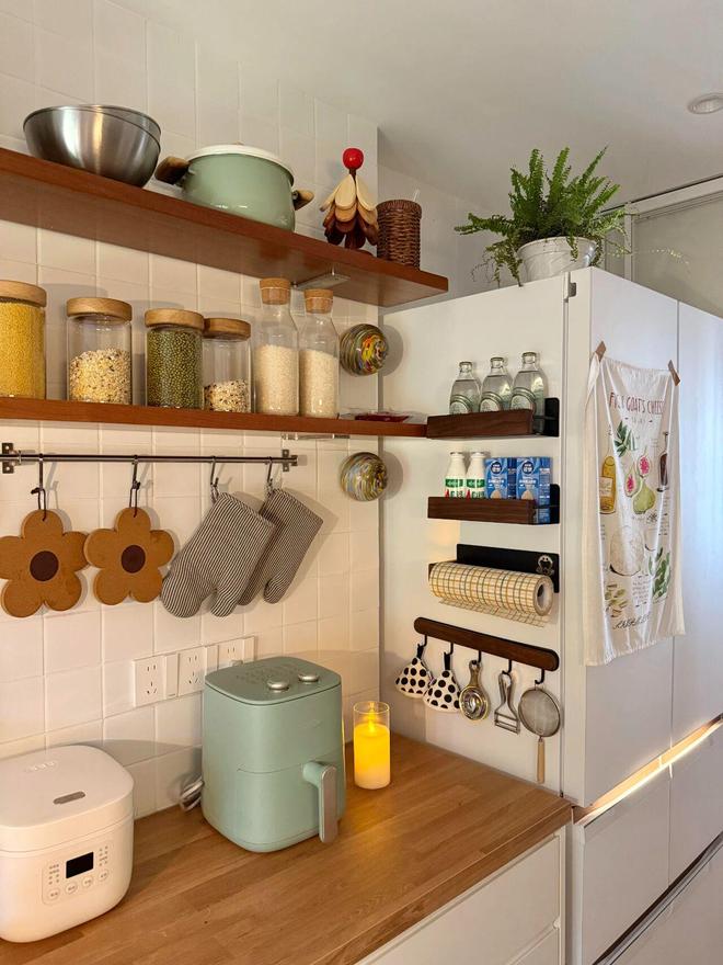 1)最常见的处理方式,是给墙面安装上“搁板+挂杆”,专门收纳一些常用的物品和工具。一来合理利用了空间,让操作变得更加顺手;二来视觉上也做到了井井有条。