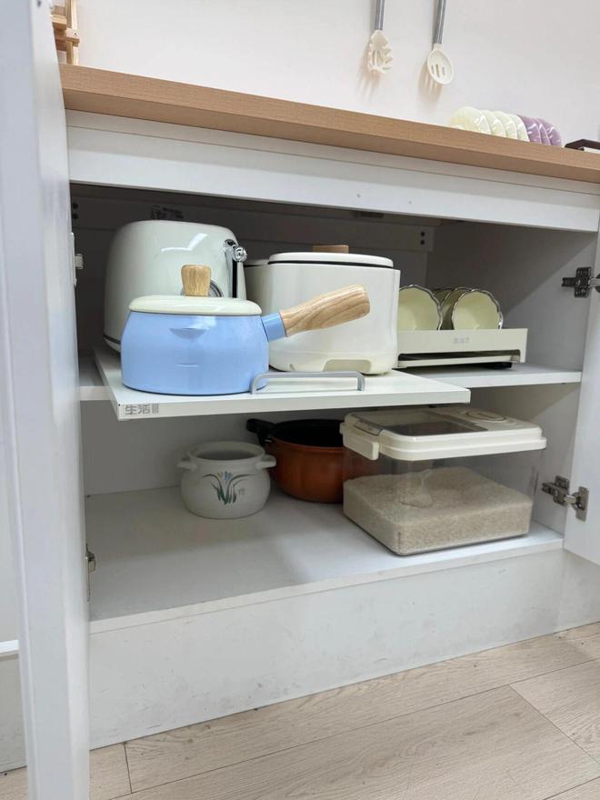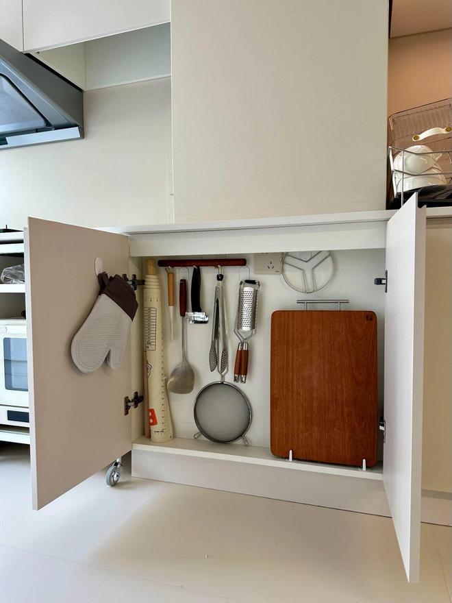 再比如9cm深的矮柜,即便不给内部做隔层,也可以用来收纳菜板和一些烹饪小工具。