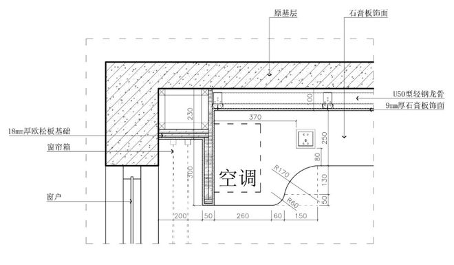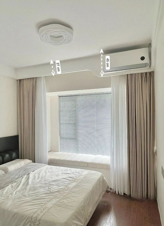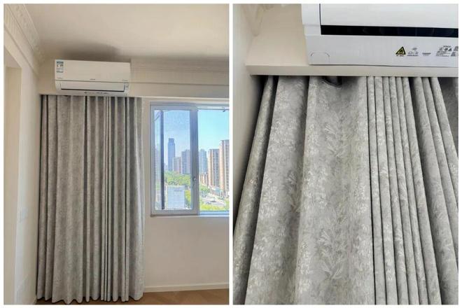 2)在窗帘盒内单独包一个小盒子,用来穿空调管。后期小盒子这里单独安装窗帘轨道,完全不会影响窗帘的美观。