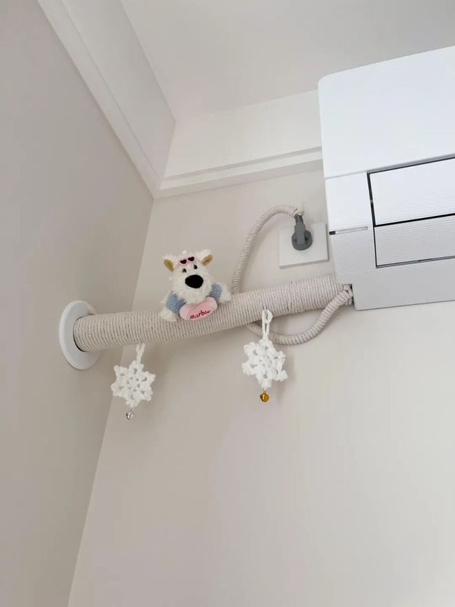 最常见的遮丑方法,就是给裸露的空调管缠上麻绳了,除了有点费手、多花点时间之外,基本上没啥难度。