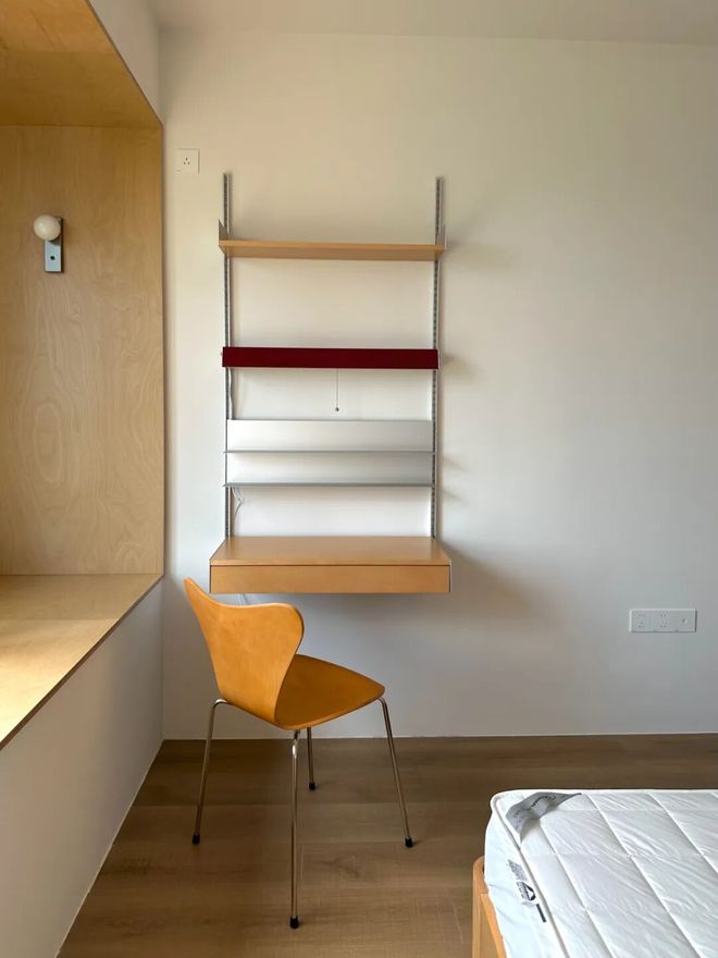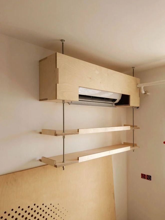比如给空调包一个小盒子,再用螺纹圆筋吊装两块层板,不仅解决了空调管道裸露的问题,还多了一个置物装饰架。