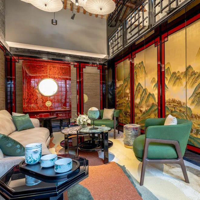 以“冬景花园”为灵感,入口的亭阁不仅是醒目的视觉亮点,也是可供驻足的空间。旗舰店的第二个入口同样呼应自然主题,向中国古典园林的诗意之美致敬。穿过户外,宾客可进入旗舰店内部。第一个空间的设计遵循风水理念,旨在营造能量和谐流动的意境。室内空间亦不乏自然元素,来自艺术家纺织艺术家Huihui的两件织物作品、艺术家Claire Nicolet绘制的穹顶画作、艺术家Olga Thune-Larsen参与创作的秸秆镶嵌工艺中央展柜等作品与宝诗龙标志性的珠宝作品相得益彰。